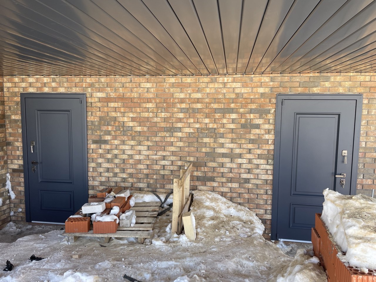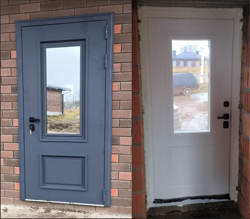 Размер 2060*980 и 2050*860, Цвет снаружи 7024 или 8019. Изнутри белая. Металл 1.5мм, Фурнитура квадратная Черная. Замки с терморазрывом. Снаружи отделка металлом + стеклопакет с тонировкой. Накладка на порог из нержавеющей стали.