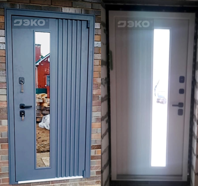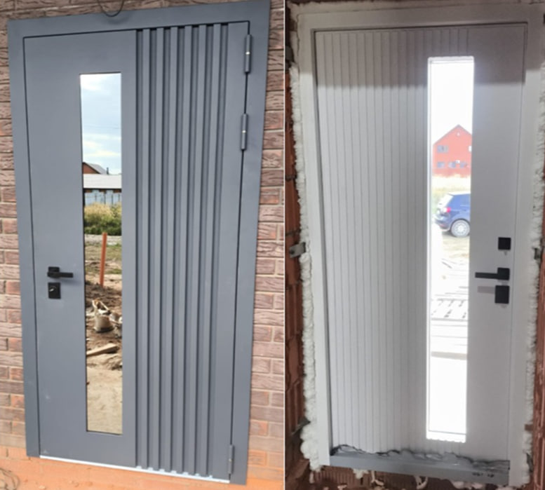 Размер 2060*980 и 2050*860, Цвет снаружи 7024. Изнутри белая. Металл 1.2мм, Фурнитура ТОР черная. Замок с терморазрывом. Наружная отделка Рейки металл + стеклопакет с тонировкой. Накладка на порог из нержавеющей стали.
