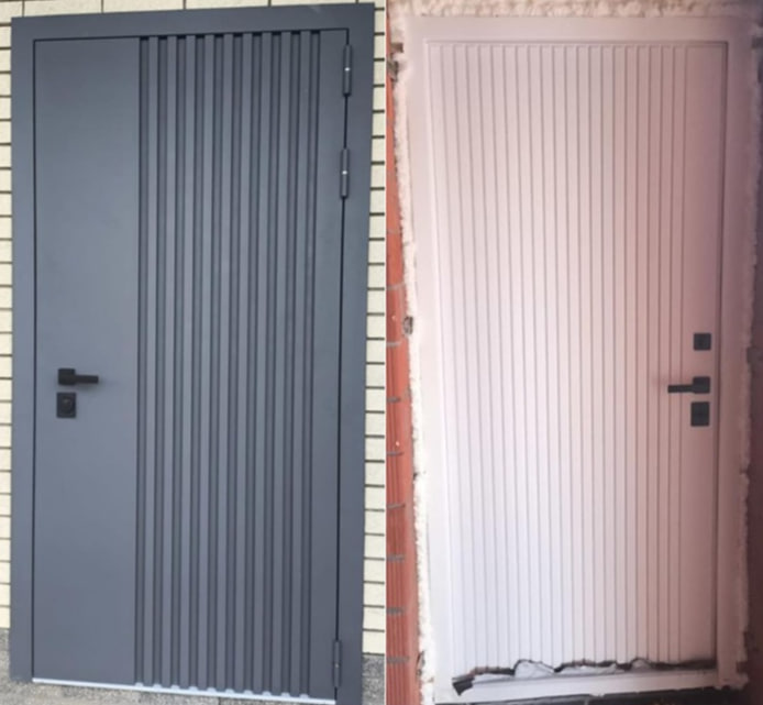 Размер 2060*980 и 2050*860, Цвет снаружи 7024. Изнутри белая. Металл 1.2мм, Фурнитура ТОР черная. Замок с терморазрывом. Наружная отделка Рейки металл. Накладка на порог из нержавеющей стали.