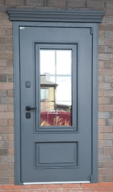 Размер 2060*980 и 2050*860, Цвет снаружи 7016, 7024 или 8019. Изнутри белая. Металл 1.5мм, Фурнитура квадратная Черная. Замки с терморазрывом. Снаружи отделка металлом Багет + Стеклопакет с тонировкой и решеткой. Накладка на порог из нержавеющей стали.